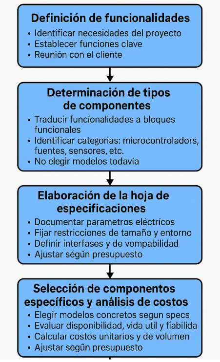 Con las funcionalidades bien definidas, el siguiente paso es traducir esos conceptos en términos técnicos. Aquí no se trata de elegir componentes específicos, sino de determinar qué tipos de elementos serán necesarios para cumplir cada función. Se agrupan en bloques funcionales, estableciendo, por ejemplo, si se requerirá un microcontrolador, amplificadores de señal, fuentes de alimentación, convertidores, entre otros. - Elaboración de la hoja de especificaciones
