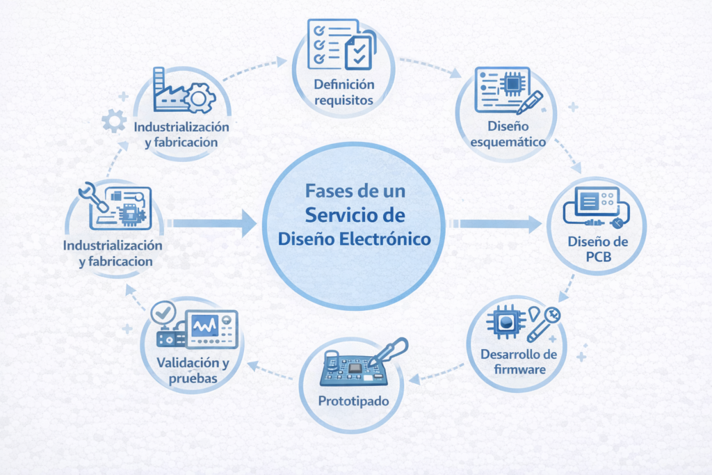 Un servicio de diseño electrónico profesional incluye mucho más que el diseño de una PCB. Abarca todo el proceso de desarrollo, desde la definición inicial hasta la fabricación del producto.